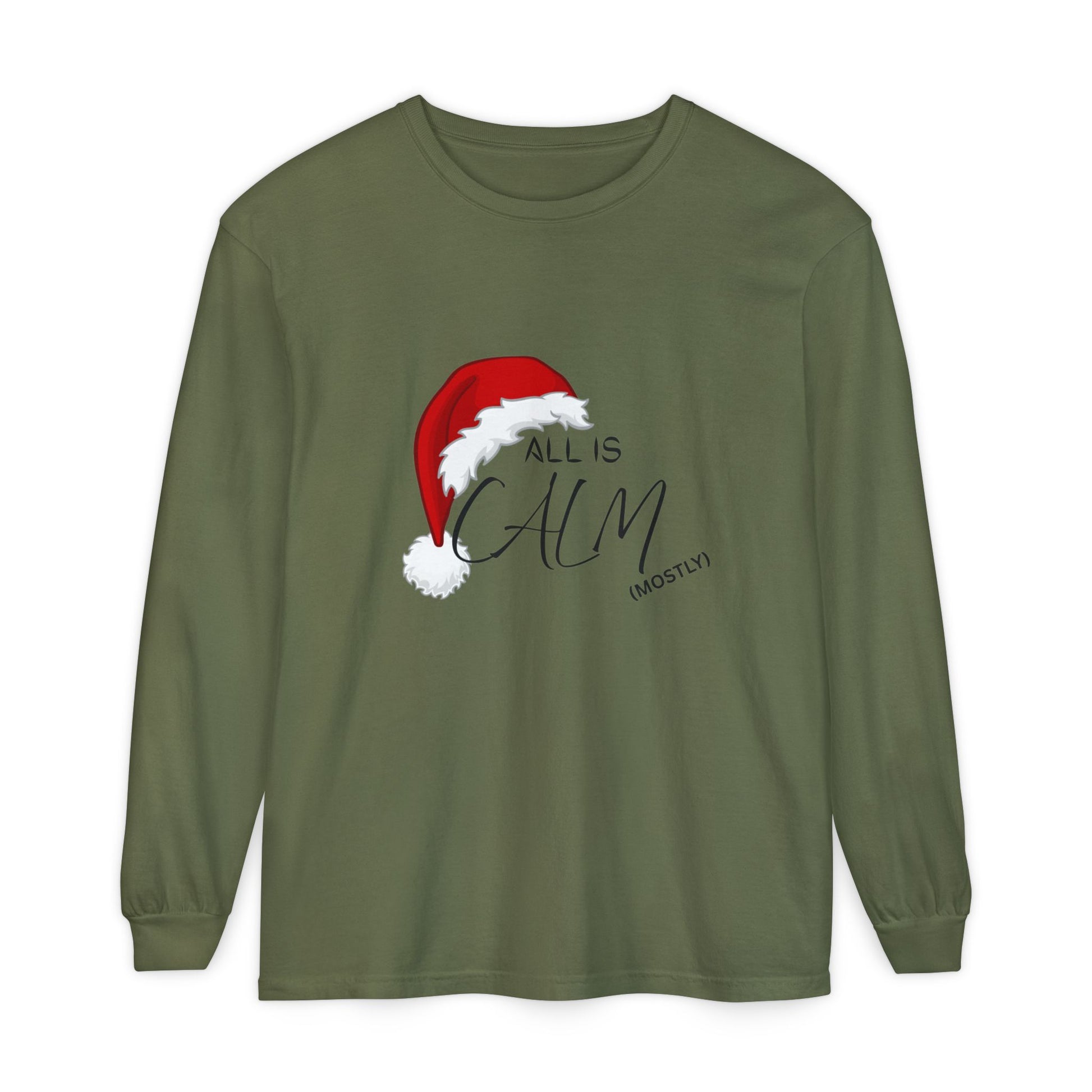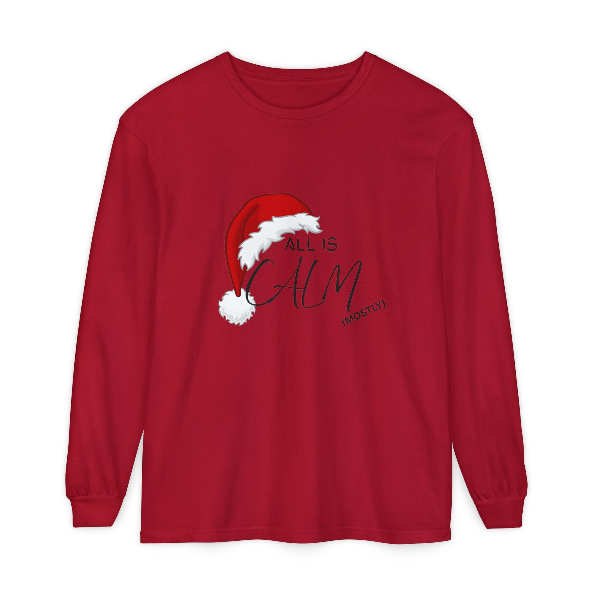 All Is Calm (Mostly) Long Sleeve Tee — Christmas Santa Hat Holiday Shirt